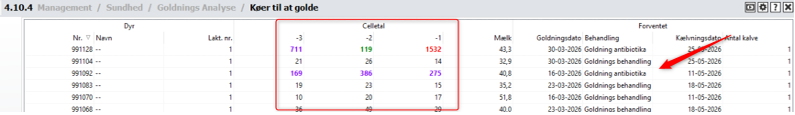 For eksempel giver denne liste dig mere indsigt i celletalsværdierne (de sidste tre før goldning) og viser også behandlingsanbefalingen for, om en antibiotikabehandling anbefales eller ej. Den sidste mælkeydelse og antallet af kalve i drægtigheden vises også.