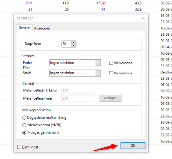Via knappen [Egenskaber] i nederste højre hjørne kan du stadig justere flere indstillinger, såsom antal dage frem, specifikke grupper der skal inkluderes eller udelukkes, grænseværdier for celletal (hvornår det betragtes som forhøjet) samt visning af mælkeydelsen.