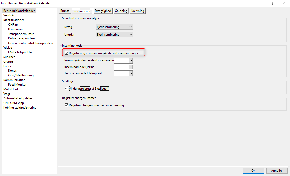 Derefter går du til ‘Reproduktionskalender’ og fanen ‘inseminering’ og sørger for, at dette felt er markeret: