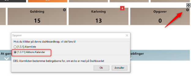 Klik på tandhjulsikonet til højre for [Opgaver] på ‘Dashboardet’, og vælg derefter [1.3.11 Aktions Kalender]: