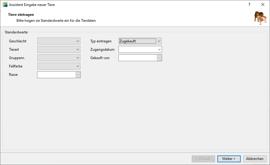 Gehen Sie zu 1.1 “Tagesereignisse” und öffnen anschließend den Reiter “Gruppeneingabe” und „Eingabe neuer Tiere“. Der folgende Assistent wird geöffnet. Tragen Sie hier optional die Standardwerte der Tiere ein. Einige dieser Werte müssen hinterlegt werden, wie die Tierart oder das Zugangsdatum.