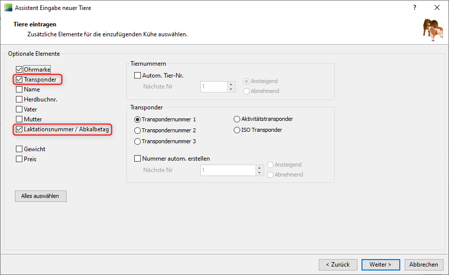 In dieser Übersicht können Sie auswählen, welche Informationen Sie angeben wollen. Falls Sie Milchkühe zugekauft haben und einen Link zu einem Prozesscomputer haben, ist es wichtig, hier die Transpondernummer und Laktationsnummer anzuwählen.