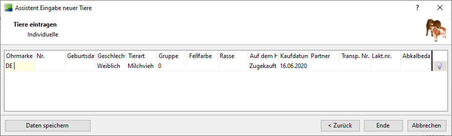 Falls die Tiere aus einem Import stammen, korrigieren Sie das Länderkürzel der Ohrmarke von DE zum jeweiligen Importland.