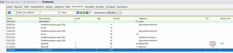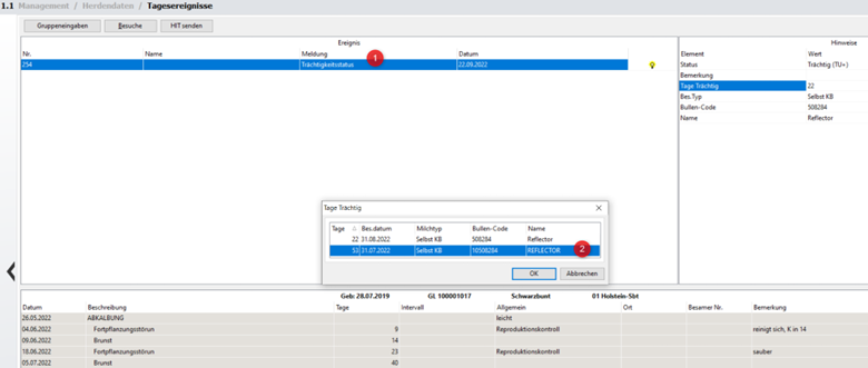 Wählen Sie in den Tagesereignissen das richtige Tier und geben Sie ihm den Trächtigkeitsstatus (1): Trächtig (TU+). Dann sehen Sie beide Besamungen und können ein früheres Datum auswählen.