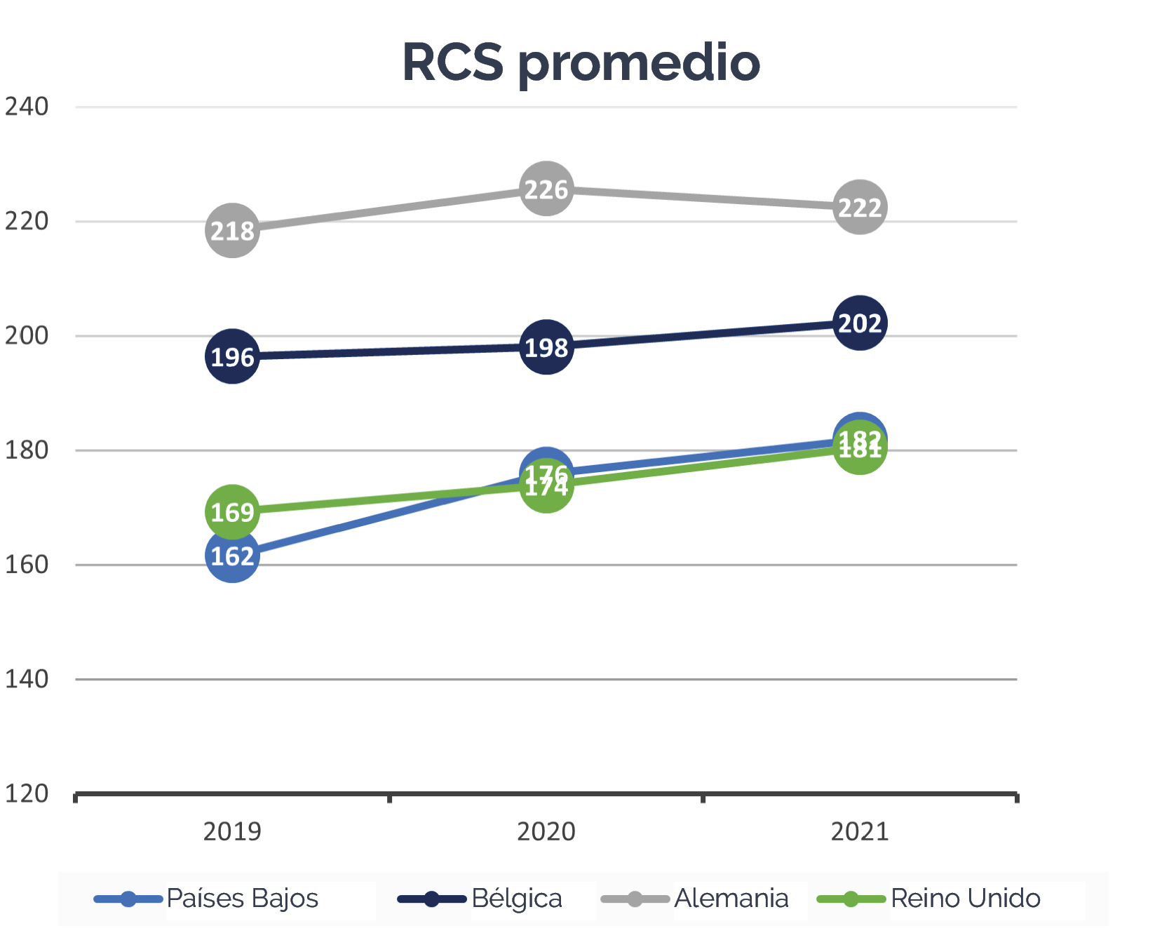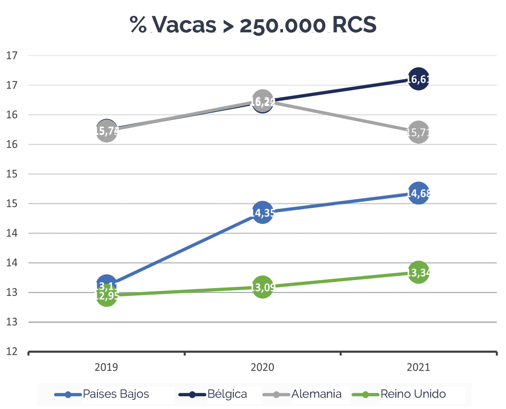 Este gráfico muestra que 2 de los 4 países de la evaluación comparativa (Reino Unido y Países Bajos) están, desde hace 3 años, por debajo de los 200.000 de RCS. Esto significa que los rebaños de estos dos países tienen, por término medio, una muy buena salud de las ubres. Bélgica tiene siempre un valor en torno a los 200.000 de RCS.