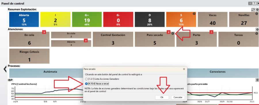Aparecerá una nueva ventana. Aquí es posible seleccionar la segunda opción y confirmar haciendo clic en [OK]. El número 5 (animales para secado) no cambiará, ya que este número permanece vinculado a los animales que aparecen en la lista de acciones ganadero.
