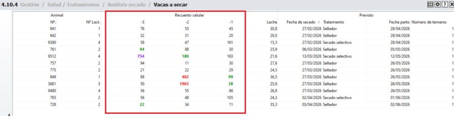 Por ejemplo, esta lista proporciona más información sobre los valores del recuento de células somáticas (los tres últimos antes del secado) y también muestra los consejos de tratamiento; si se recomienda o no un tratamiento con antibiótico. También se muestran la última producción de leche y el número de terneros en gestación.