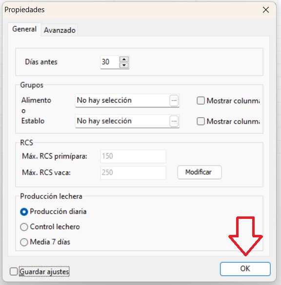 A través del botón [Propiedades] situado en la esquina inferior derecha, es posible ajustar ciertos parámetros, como el número de días por adelantado, los grupos específicos que se deben incluir o excluir, los umbrales de recuento de células somáticas (cuándo se considera elevado) y la visualización de la producción de leche.