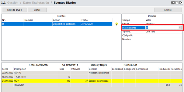 En este ejemplo un animal ha estado con un toro. Al cabo de unos días se hace un control de preñez. Ella está gestante y esto se registra en el menú de Eventos Diario. El programa pregunta la cantidad de días que el animal lleva gestante y si esto será insertado, el programa está haciendo una estimación de la fecha de servicio.