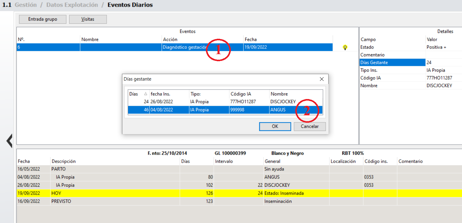 Elija el animal en Eventos Diarios y seleccione el estado de preñez (1): preñez +. A continuación, verá las dos inseminaciones, en donde podrá seleccionar la inseminación previa.