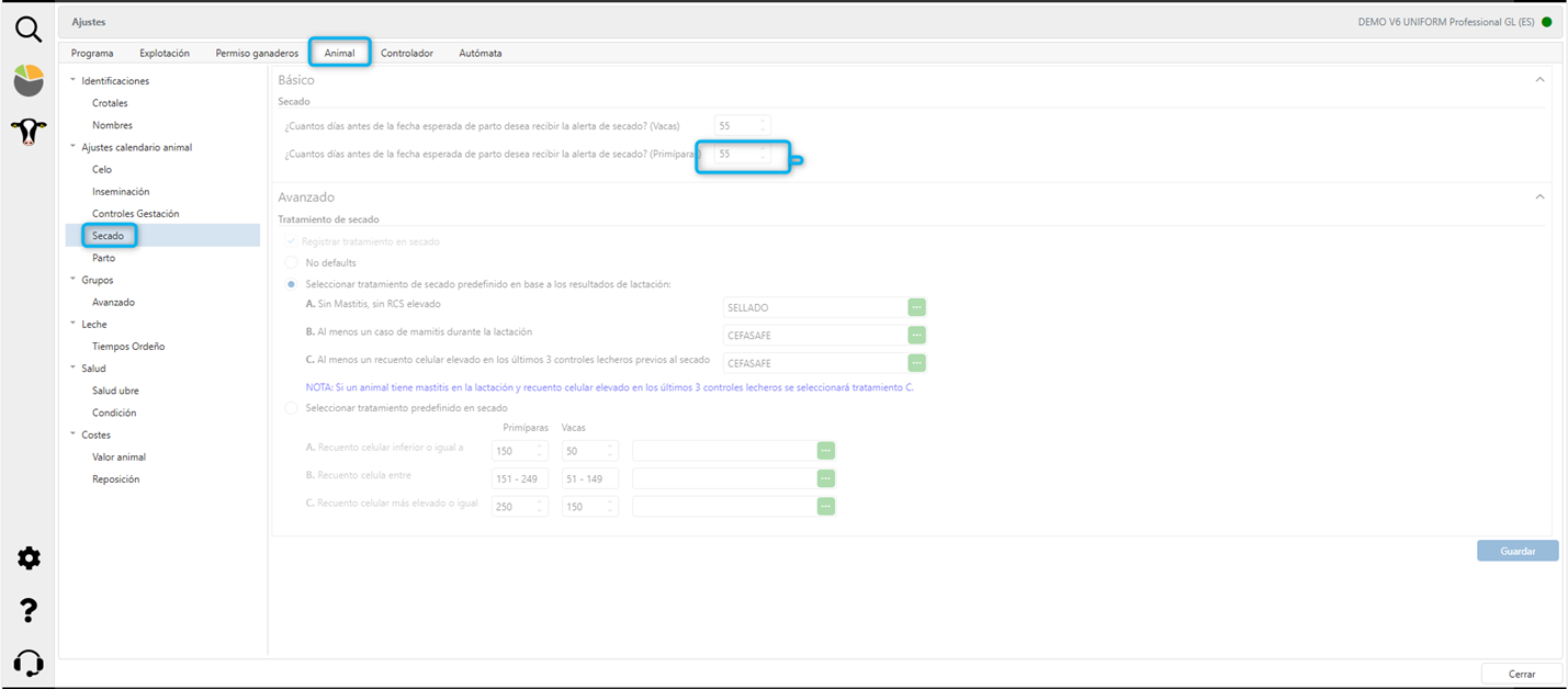 A continuación, se mostrará la pantalla de los ajustes generales y encontraremos el ajuste deseado bajo la pestaña de Animal. Haz clic en la opción Secado y ve a la pestaña tal como se muestra en el ejemplo de la imagen. Escribe el periodo de secado objetivo deseado para primíparas.