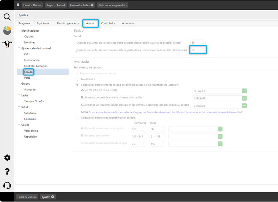 En ocasiones, el periodo de secado en vacas primíparas desea realizarse antes que en vacas de lactaciones superiores. En el programa es posible configurar un periodo de secado diferente para las vacas de 1ª lactación y para las vacas que están en 2ª lactación o superiores. Puedes hacerlo de la siguiente manera: