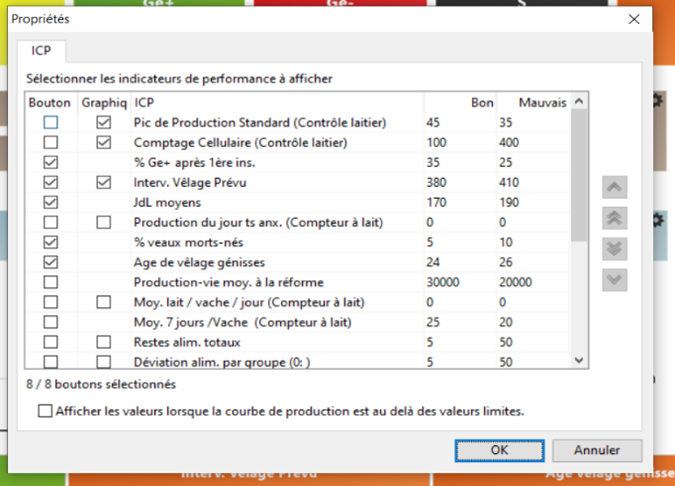 Si Bon > Mauvais (pour la production laitière par exemple), alors en dessous de la valeur inscrite dans « Mauvais », le bouton sera rouge, entre « Bon » et « Mauvais » l’indicateur sera orange, et au-dessus de « Bon » l’indicateur sera vert.