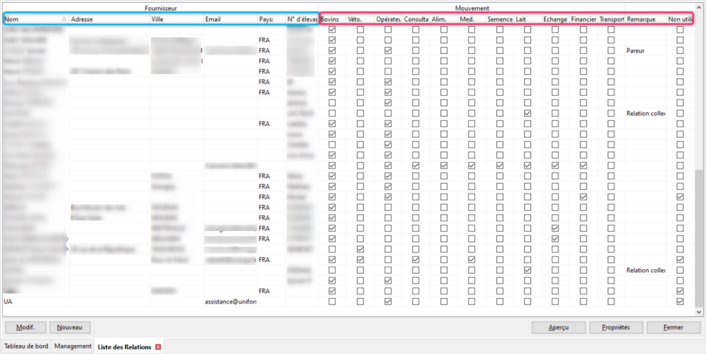 Pour chaque relation vous retrouverez son nom, son adresse, sa commune, son adresse mail, son pays, le numéro d’élevage (si c’est pertinent) et enfin le ou les types de relations que vous partagez (en rose).