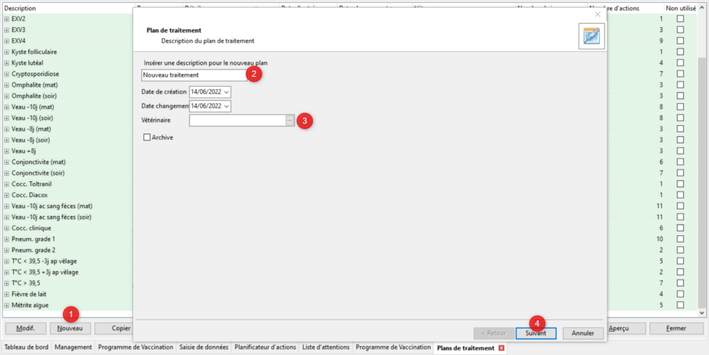 Pour créer un nouveau plan de traitement cliquez sur [Nouveau] (1). Indiquez le nom de votre plan (2). Par défaut la date de création et la date de modification sont celles du jour. Vous pouvez indiquez le nom du vétérinaire prescripteur du plan (facultatif) (3). Cliquez sur [Suivant].