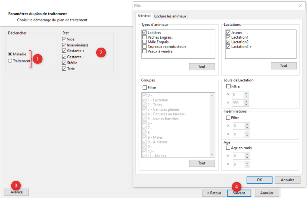 Il faut ensuite choisir ce qui va déclencher le plan: une maladie ou un traitement (1). Sélectionner les états de gestation des vaches pouvant bénéficier de ce plan de traitement (2). Si vous avez besoin d’affiner la sélection cliquez sur le bouton [Avancé] (4). Vous pourrez combiner plusieurs filtres: les types d’animaux, le nombre de lactation, le groupe d’alimentation, les jours de lactations, le temps avant/après une insémination et l’âge. Cliquez sur [Suivant].