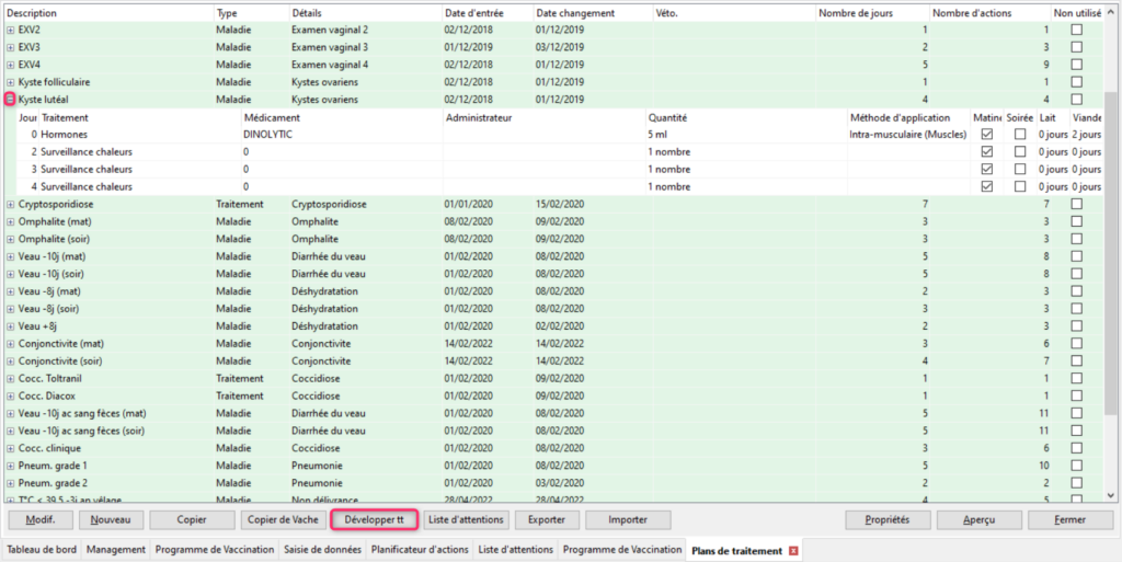 Pour les maladies qui nécessitent de combiner plusieurs traitements, éventuellement sur plusieurs jours, il est intéressant de créer un plan de traitement. Là encore vous gagnerez en temps et limiterez le risque d’erreur. Pour créer un plan de traitement rendez vous dans Management/Données Troupeau/Planificateur d’actions/Plan de traitement. Vous retrouverez dans cet écran la liste de tous vos plans de traitement. Pour voir le détail d’un des plans déroulez-le en cliquant sur le petit [+] à gauche de son nom ou vous pouvez cliquer sur le bouton [Développer tout] pour tous les visualiser d’un coup.