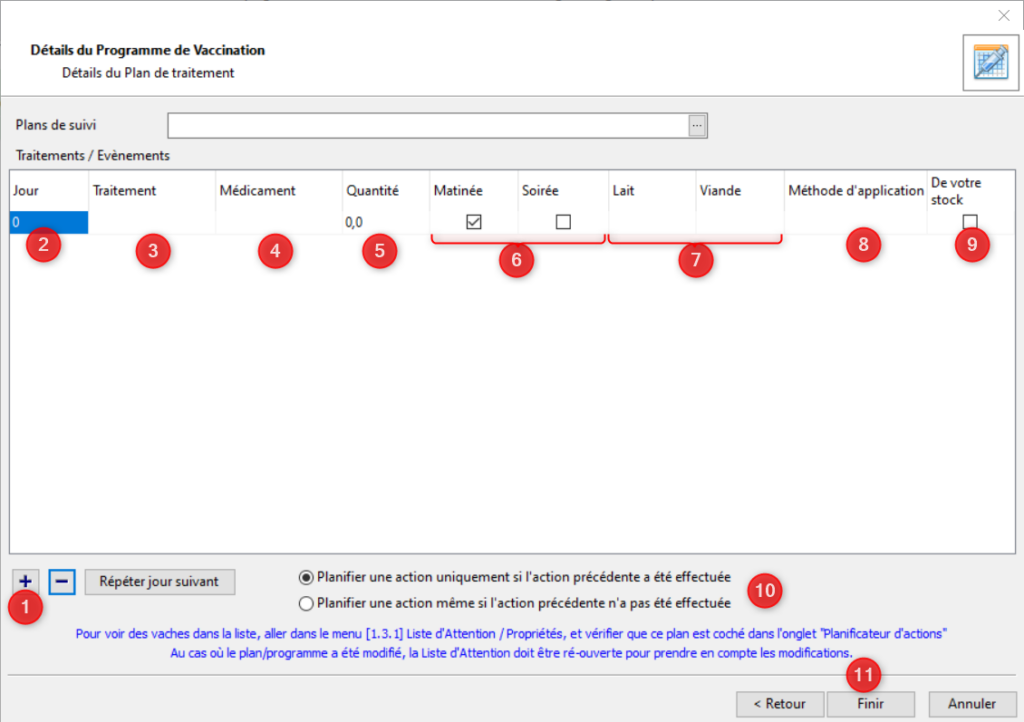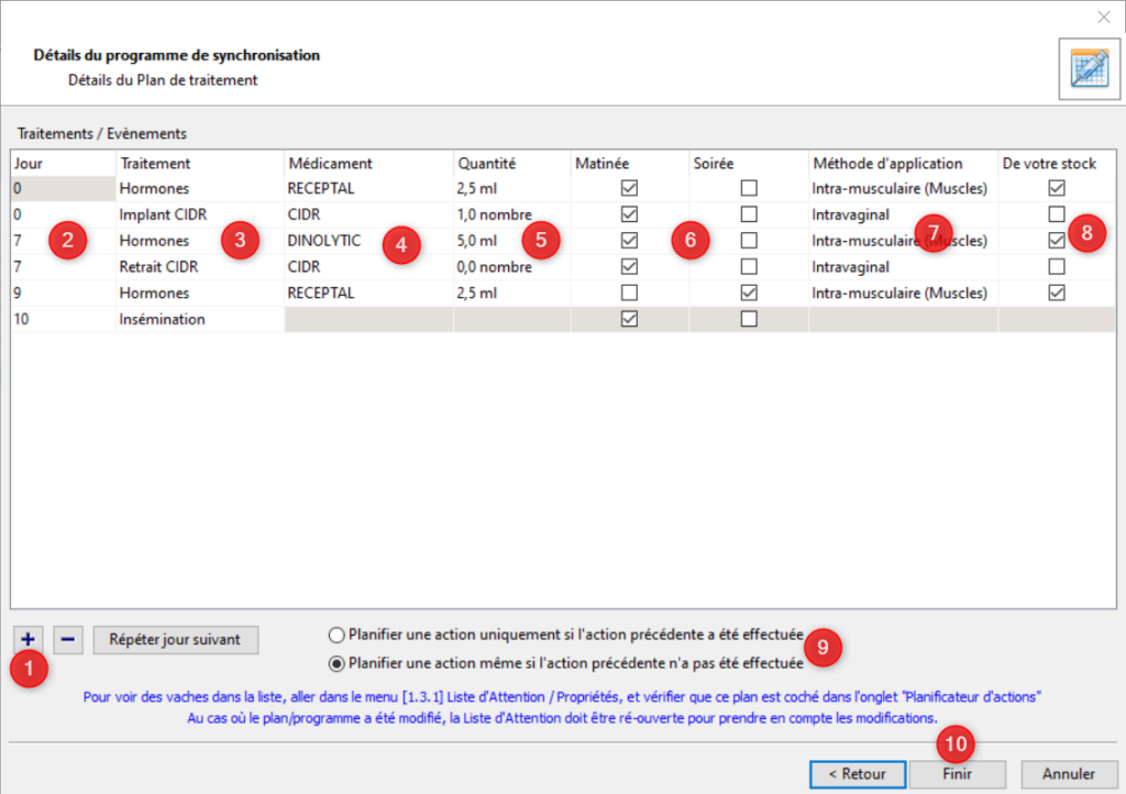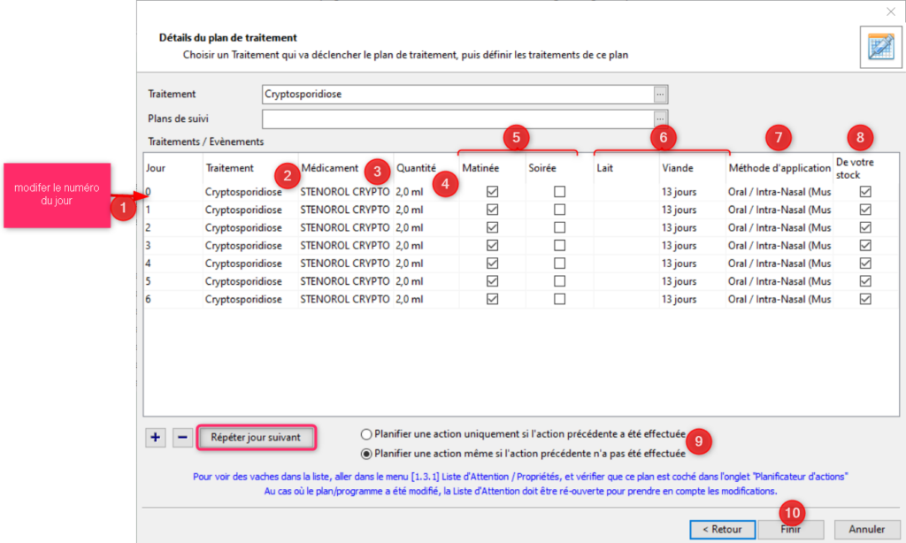 Réglez le jour d’application du traitement (1), le traitement (2), le médicament associé (3), la quantité de médicament (4), le moment d’application (matin et/ou soir) (5), la période d’attente lait et viande (6), la méthode d’application (7) et enfin si les médicaments doivent venir de votre stock ou non (8). Ajoutez autant de lignes que nécessaire. Si vous avez besoin de réaliser plusieurs traitements le même jour, il suffit d’indiquer le même jour dans la colonne jour pour ces traitements. Si vous souhaitez répéter un même traitement le jour suivant cliquez sur [Répéter le jour suivant] (encadré en rose). Les traitements seront considérés comme des actions à réaliser. Vous devez choisir entre les planifier uniquement si l’action précédente a été réalisée ou même si l’action précédente n’a pas été réalisée (9). Une fois le plan défini, cliquez sur [Finir] (10).