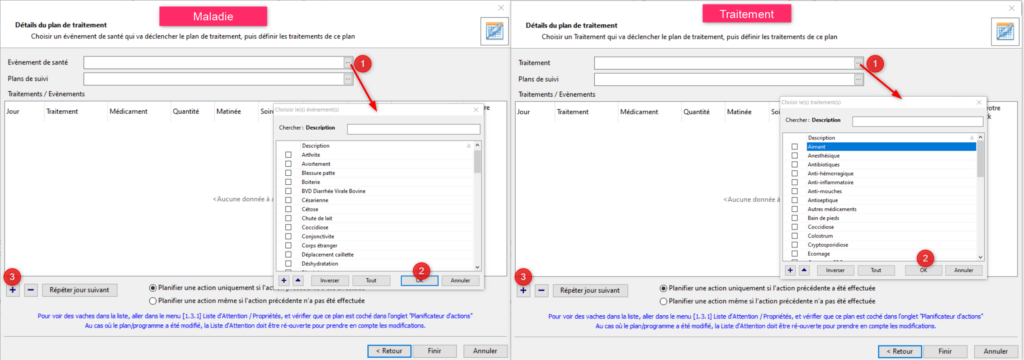 Sélectionnez la maladie (ou le traitement) dans la liste simplifiée correspondante. Il est possible d’ajouter un élément à la liste s’il n’y est pas encore. Vous pouvez choisir plusieurs éléments. Si ça a lieu d’être, choisissez également un plan de suivi. Vous allez ensuite pouvoir ajouter des lignes de traitement à votre plan. Cliquez sur le bouton [+].
