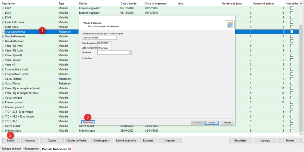 Sélectionnez le plan de traitement dans votre liste (1) puis cliquez sur le bouton [Modifiez] (2). Si vous souhaitez modifier votre plan suivez les mêmes étapes que lors de la création en réalisant les changements nécessaires. Si vous souhaitez supprimer le plan, cliquez sur supprimer (3).
