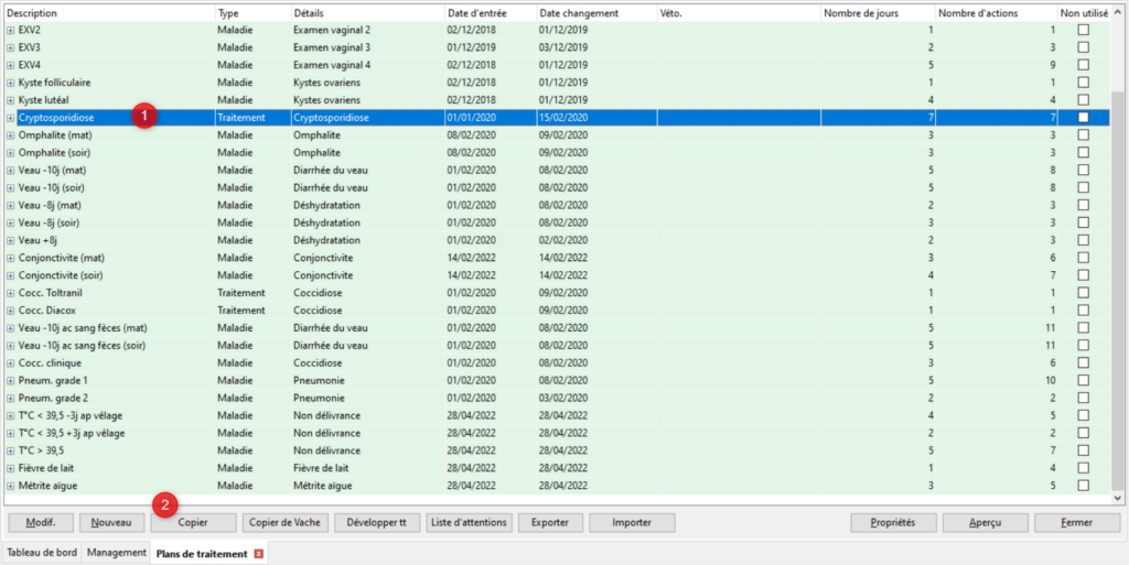 A partir des listes de maladies/traitements/médicaments il est possible de créer des protocoles de santé. Ces protocoles regroupent les plans de traitement, les programmes de vaccination et les programmes de synchronisation. L’idée est la même dans les trois cas: tous les animaux qui suivent ces plans reçoivent exactement la même chose (même traitement et éventuellement médicament). Cela permet d’être plus rapide dans la saisie de données et de faire moins d’erreurs de saisie.