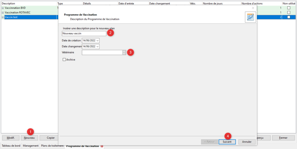 Cliquez sur le bouton [Nouveau] (1). Renseignez le nom de votre nouveau programme de vaccination (2). Par défaut la date de création et de changement sont celle du jour mais vous pouvez les modifier. Vous pouvez indiquer le vétérinaire qui vous a prescrit le programme (3) mais ce n’est pas obligatoire. Cliquez sur [Suivant].