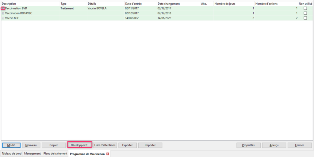 Pour gérer la vaccination de vos animaux, il est conseillé de créer des programmes de vaccination. Rendez vous dans Management/Données Troupeau/Planificateurs d’actions/Programme de vaccination. Dans cet écran vous retrouverez un tableau qui récapitule tous vos programmes de vaccination. La présentation est identique à celle des plans de traitement. Pour visualiser le détail d’un programme, déroulez le avec le petit [+] ou vous pouvez cliquer sur le bouton [Développer tout] pour tous les visualiser d’un coup.