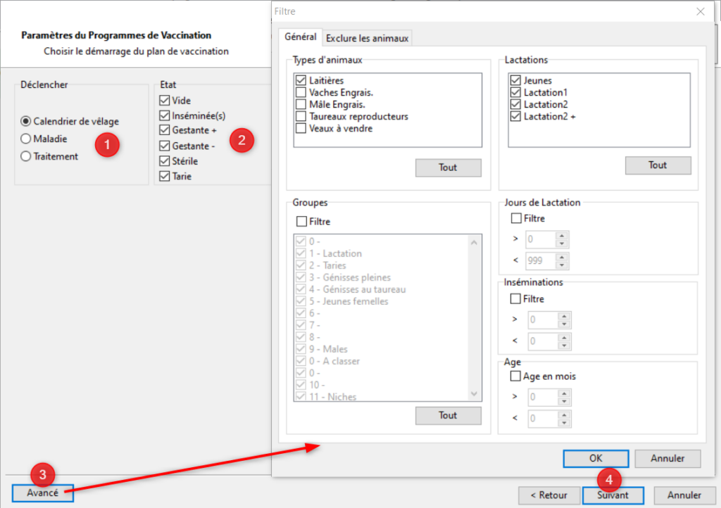 Le déclenchement du programme peut avoir lieu en fonction du calendrier de vêlage ou de l’enregistrement d’un maladie ou de l’enregistrement d’un traitement (1). Sélectionnez les états de gestation des vaches pouvant bénéficier du plan (2). Si besoin, vous pouvez affiner la sélection en allant dans [Avancé] (3). Cliquez sur [Suivant] quand vous avez choisi vos options (4).