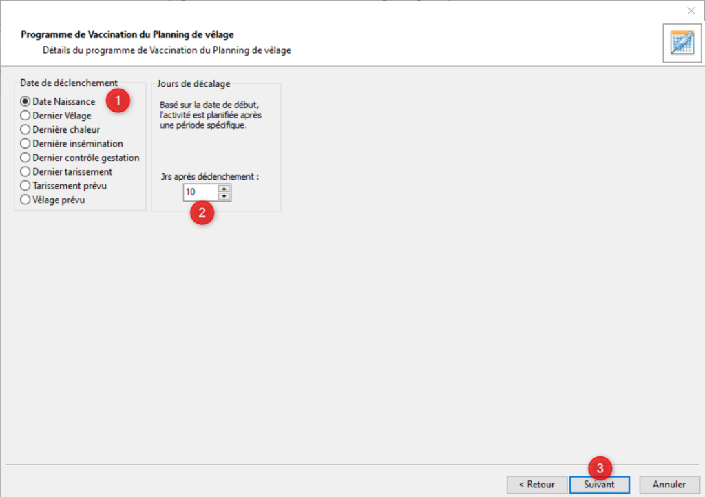 Vous devez choisir une date de déclenchement (1). Eventuellement vous pouvez planifier d’effectuer la tâche un certain nombre de jours après la date de déclenchement (2). Par exemple, si la vaccination doit avoir lieu 10 jours après la naissance vous allez cocher Date naissance puis indiquer 10 dans le champ Jrs après déclenchement. Cliquez sur [Suivant] (3).