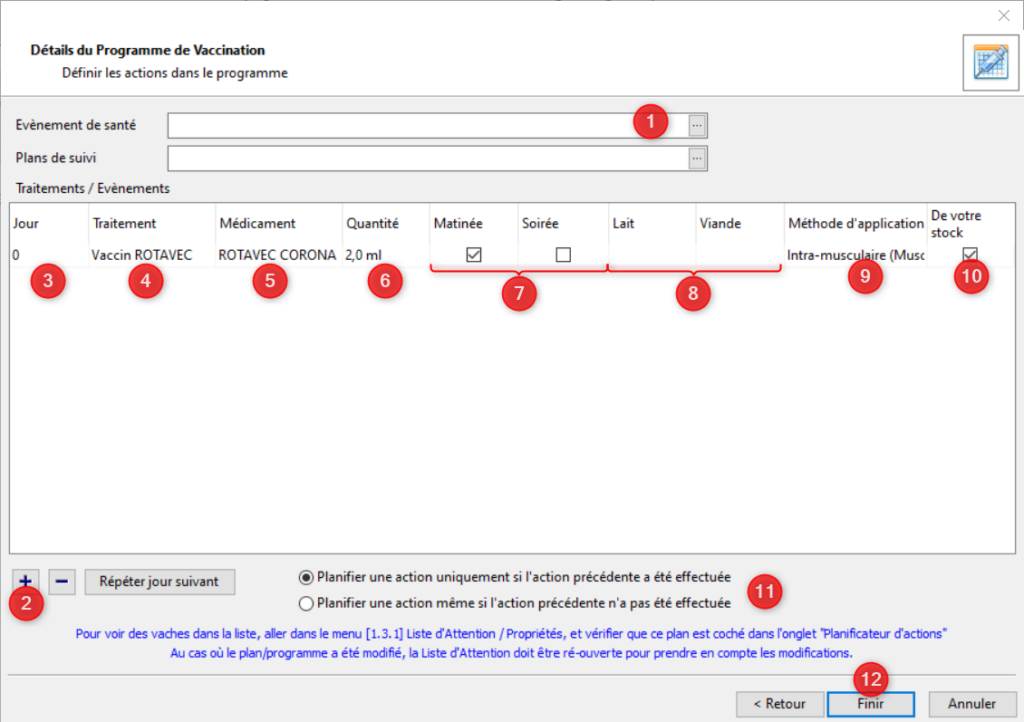 Avec le bouton [+] ajouter une ou plusieurs lignes de traitements (1). Indiquez pour chaque ligne, le jour du traitement (2), le traitement (3), le médicament (4), la quantité (5), le moment d’application (matin et/ou soir,6), les délais d’attente lait et viande (7), la méthode d’application (8) et enfin si le produit doit provenir ou non de votre stock (9). Vous pouvez éventuellement indiquez un plan de suivi. Les traitements sont considérés comme des actions à réaliser. Vous pouvez planifier l’administration du traitement suivant même si le précédent n’a pas été administré ou attendre que le précédent ait été administré pour prévoir le suivant (10). Cliquez sur [Finir]