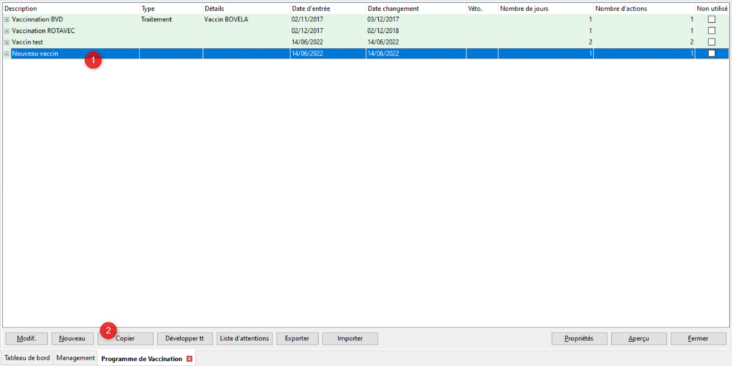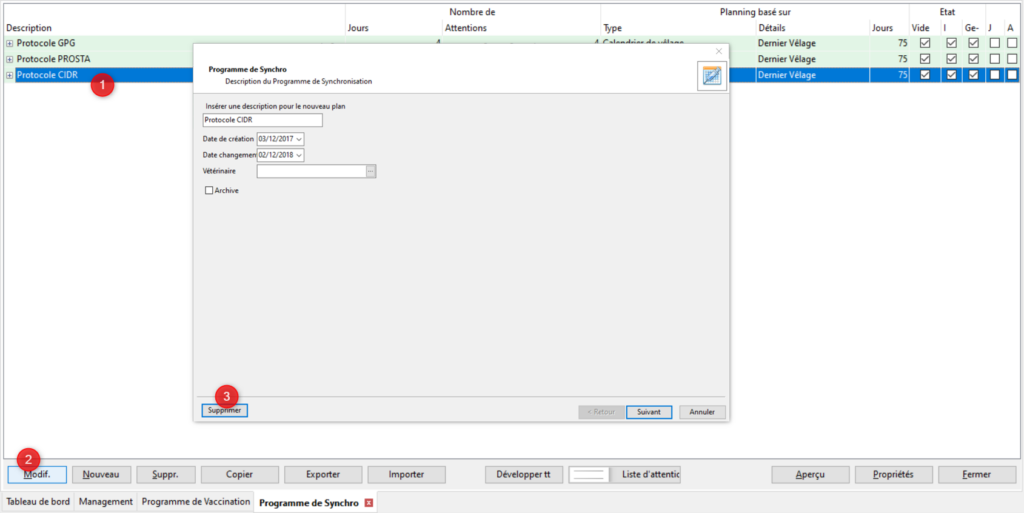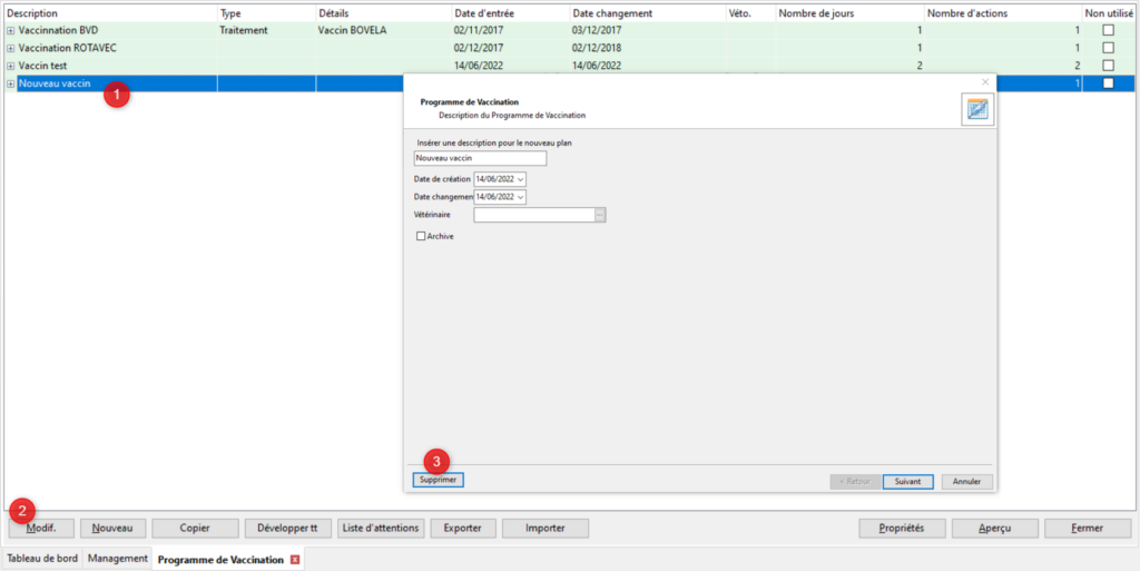 Pour modifier ou supprimer un plan de vaccination sélectionnez le dans le tableau (1) puis cliquez sur [Modif.] (2). Si vous souhaitez supprimer le programme de vaccination cliquez sur le bouton [Supprimer] (3). Si vous souhaitez simplement modifier le programme suivez le déroulement des étapes normalement en changeant les informations nécessaires.
