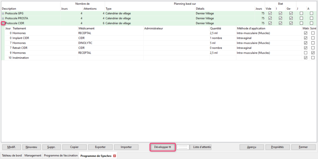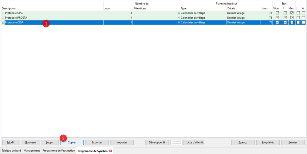 Synchroniser les chaleurs des vaches peut être utile selon le mode d’organisation de l’exploitation. Pour vous y aider, vous pouvez créer un programme de synchronisation dans le logiciel. Rendez vous dans Management/Données Troupeau/Planificateur d’actions/Programme de Synchro.
