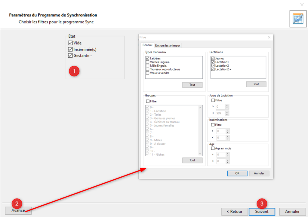 Vous pouvez filtrer les animaux selon leur état: vide, inséminées ou gestante (1). pour affiner encore plus votre tri utilisez les options disponibles en cliquant sur le bouton [Avancé] (2). Cliquez sur [Suivant] (3).