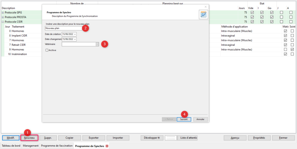 Pour créer un nouveau programme de synchronisation cliquez sur [Nouveau] (1). Renseignez le nom de votre programme (2). La date de création et la date de changement sont lises à la date du jour par défaut mais sont modifiables. Vous pouvez sélectionner le vétérinaire qui vous a prescrit le plan si vous le souhaitez (3). Cliquez sur [Suivant] (4).