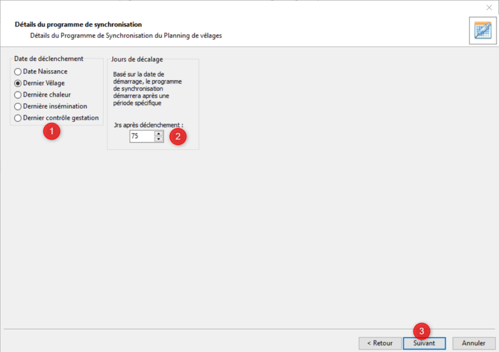 Vous devez choisir la date de déclenchement du programme (1). Il est possible de décaler le déclenchement par rapport à cette date en renseignant un nombre jours après le déclenchement (2). Par exemple si vous souhaitez que le programme se déclenche 75 jours après le dernier vêlage cochez Dernier vêlage puis indiquez 75. Cliquez sur [Suivant] (3).