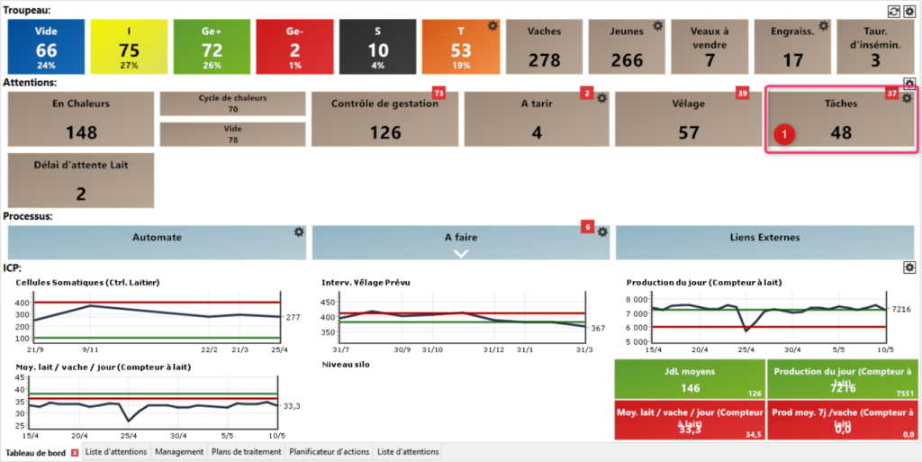 Depuis votre tableau de bord, vous pouvez directement accéder à la liste de vos tâches en cliquant sur la tuile (1). Le nombre inscrit sur la tuile correspond au nombre de tâches dans la liste comme pour les autres listes d’attentions. Le nombre dans le petit carré rouge indique les tâches en retard (retard défini selon votre paramétrage).