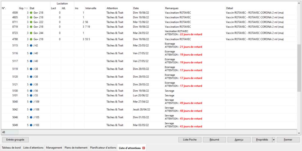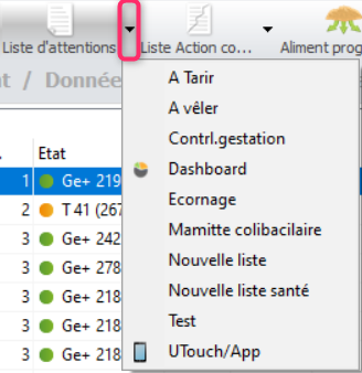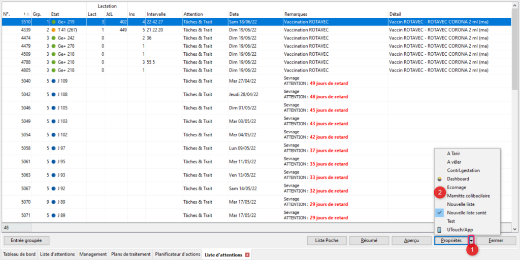 Vous pouvez également passer par le menu de navigation classique: Management/Données Troupeau/ Listes d’actions/Liste d’attentions (menu 1.3.1). Une des listes va s’ouvrir vous pourrez suivre exactement la même marche à suivre avec la petite flèche du bouton [Propriétés].