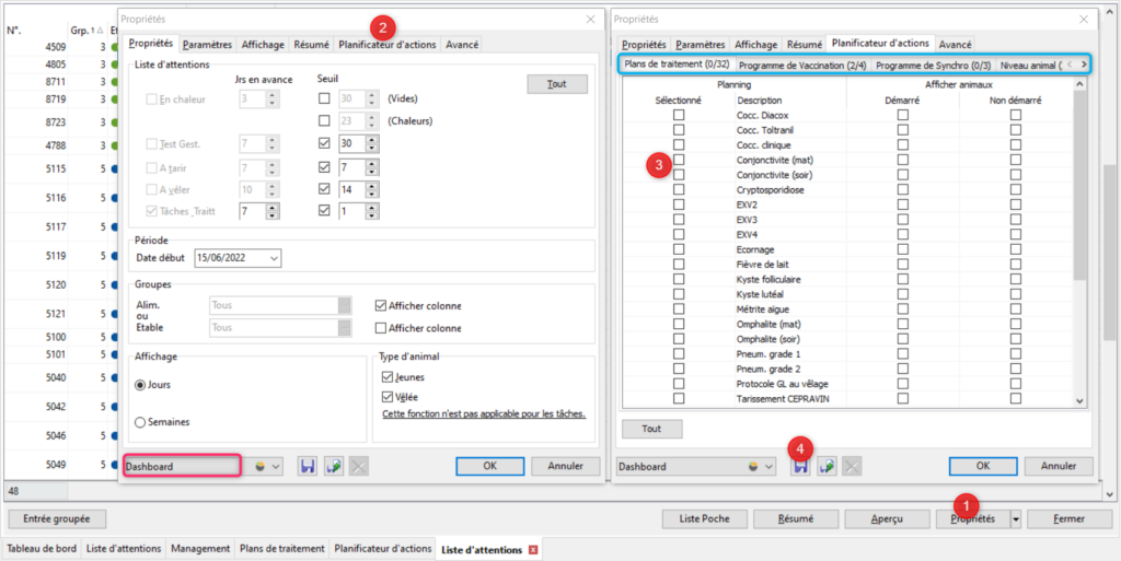 Vous pouvez choisir quelles actions doivent y être répertoriées en allant dans Propriétés. Nous allons nous focaliser sur ce qui relève du planificateur d’action dans cette section. Cliquez sur [Propriétés] (1). Les propriétés de la liste s’ouvrent dans une fenêtre comportant plusieurs onglets. Vous noterez que vous êtes dans les propriétés de la liste accessibles depuis le tableau de bord (Dashboard) (encadré en rose). Allez dans l’onglet Planificateurs d’actions (2). Vous allez retrouvez des sous-onglets (entourés en bleu). Ces sous-onglets correspondent aux plans de traitements, plans de vaccination, plans de synchronisation, autres actions au niveau de l’animal (comme l’écornage par exemple) et autres actions au niveau de la ferme. Si vous êtes dans le sous-onglet Plans de traitements vous allez retrouver la liste de tous vos plans de traitements. Si vous souhaitez que les animaux relevant de certains de ces plans apparaissent dans votre liste de tâches cochez les plans correspondants (3). Il en va de même pour les autres sous-onglets. Pour sauvegarder vos modifications cliquez sur la petite disquette bleue (4).