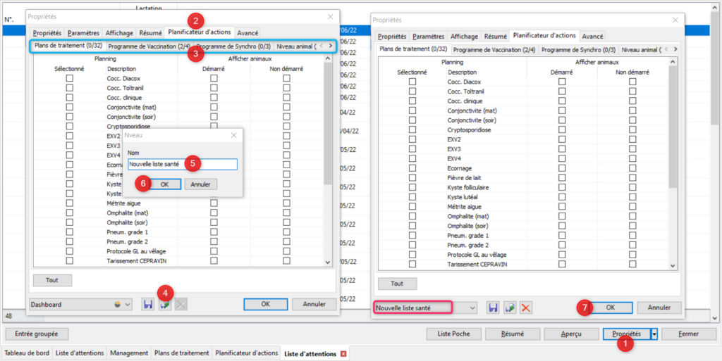 Pour créer ces listes pour la première fois, rendez-vous dans les Propriétés de la liste de tâches du tableau de bord (1) comme précédemment. Nous allons prendre un exemple pour simplifier les explications. Si vous souhaitez que votre liste ne concerne que les animaux concernés par un certain vaccin, rendez-vous dans l’onglet Planificateur d’actions (2) puis dans Programme de vaccination (3). Cochez le programme qui vous intéresse (3). Décochez tous les autres y compris dans les autres sous-onglets (3). Enfin au lieu de cliquez sur la disquette bleu vous allez cliquez juste à côté sur la disquette avec une flèche verte (4). Entrez le nom de votre nouvelle liste (5). Cliquez sur [OK] (6). Vous noterez que c’est le nom de votre nouvelle liste qui s’affiche (encadré rose). Cliquez sur [OK] une deuxième fois pour fermer les propriétés (7).