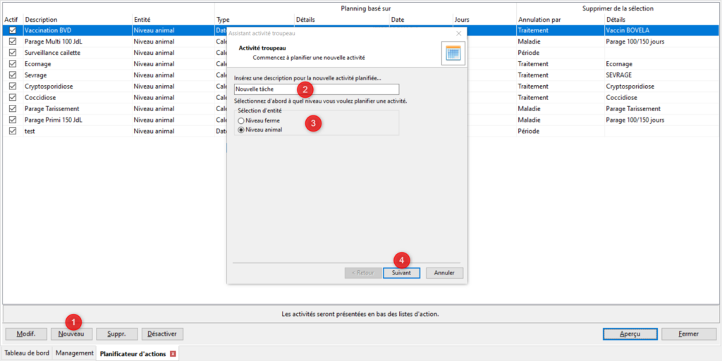 Pour créer une nouvelle action planifiée, cliquez sur le bouton [Nouveau] (1). L’assistant activité troupeau s’ouvre. Donnez un nom à votre activité (2). Choisissez le niveau auquel vous souhaitez planifier l’activité (3). Si votre activité concerne une action à mener avec/sur certains animaux sélectionnez l’option « Niveau animal ». Cela concerne les activités de même type que l’écornage par exemple. Si votre activité est une activité plus globale comme par exemple pailler les veaux ou curer sélectionnez l’option « Niveau ferme ».