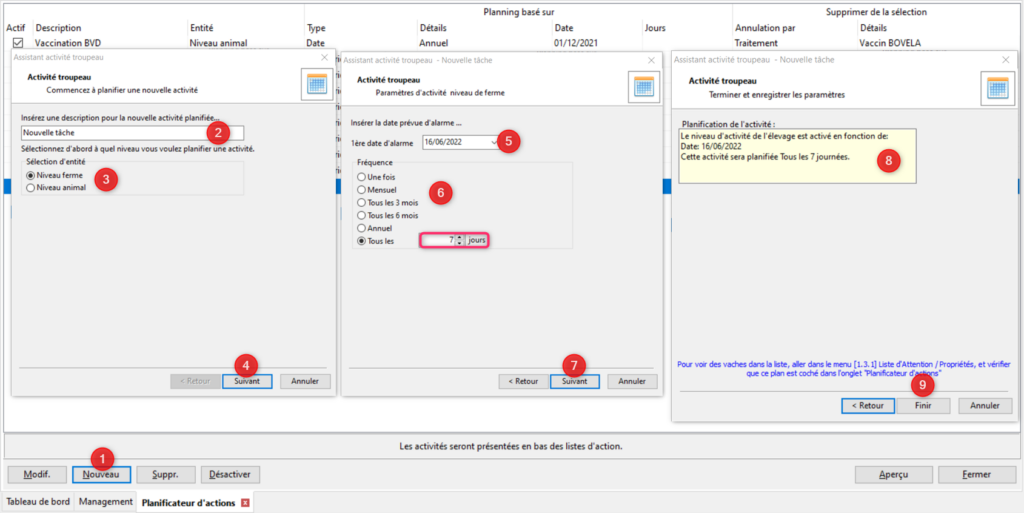 Il convient tout d’abord de planifier votre tâche, ici l’écornage des veaux. Pour planifier une action rendez vous dans le menu Management/Données Troupeau/Planificateur d’actions/ Planificateur d’actions (menu 1.14.1). Dans cet écran vous retrouverez la liste de vos actions planifiées. Pour créer une nouvelle action planifiée, cliquez sur le bouton [Nouveau] (1). L’assistant activité troupeau s’ouvre. Donnez un nom à votre activité (2). Choisissez le niveau auquel vous souhaitez planifier l’activité (3). Si votre activité concerne une action à mener avec/sur certains animaux sélectionnez l’option « Niveau animal ». C’est le cas avec l’écornage ici. Passez à l’étape suivante. Choisissez sur quoi vous allez baser le déclenchement de l’action: pour l’écornage nous allons nous basé sur l’âge de l’animal donc il faut choisir l’option « Calendrier de vêlage » (4). Vous pouvez filtrer les animaux selon leur état (vide, inséminée…) mais dans ce cas précis vous pouvez tout laisser coché. Il est également possible d’affiner votre filtre sur les animaux. Cliquez sur le bouton [Avancé] (5). Une fenêtre supplémentaire s’ouvre. Vous avez la possibilité de choisir le type d’animaux mais dans notre cas nous allons tout laisser coché (6). Puis vous pouvez choisir le nombre de lactations. Ici nous voulons pratiquer l’écornage sur de jeunes animaux donc cochez uniquement « Jeunes » (7). Pour finir nous allons filtrer sur l’âge en considérant uniquement les animaux qui ont entre 0 et 2 mois (8). Cliquez sur [OK] (9). La fenêtre disparait et vous retrouvez l’assistant.