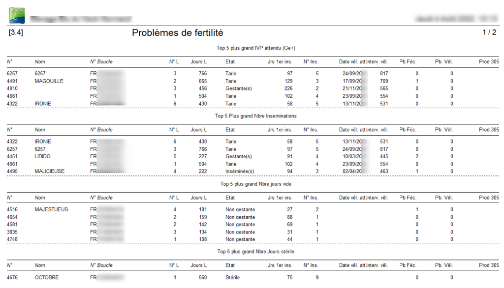 Ce rapport montre les vaches qui ont les principaux problèmes de fertilité.