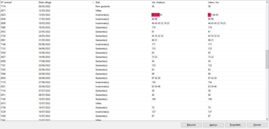Cliquez sur [Résumé] pour voir une synthèse des données, dans un format imprimable : JDL moyens aux premières chaleurs, nombre de vaches avec un intervalle > 30 jours, etc.