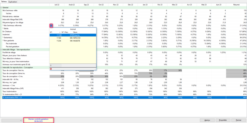 Pour savoir quels animaux sont pris en compte pour le calcul d’une valeur il suffit de placer le pointeur sur la case et de cliquer sur le petit bouton [i] bleu qui apparait. La liste des animaux est affichée.