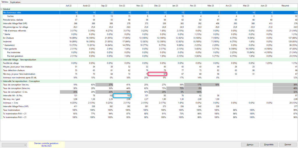 Intervalle Vêl – IA Féc. en octobre 2022 = 102 jours. Cela signifie que l’intervalle moyen entre le vêlage des animaux ayant vêlé en octobre 2022 et leur insémination fécondante est de 102 jours. De même que pour l’exemple précédent, si un animal n’a pas été inséminé alors il n’est pas pris en compte dans le calcul.