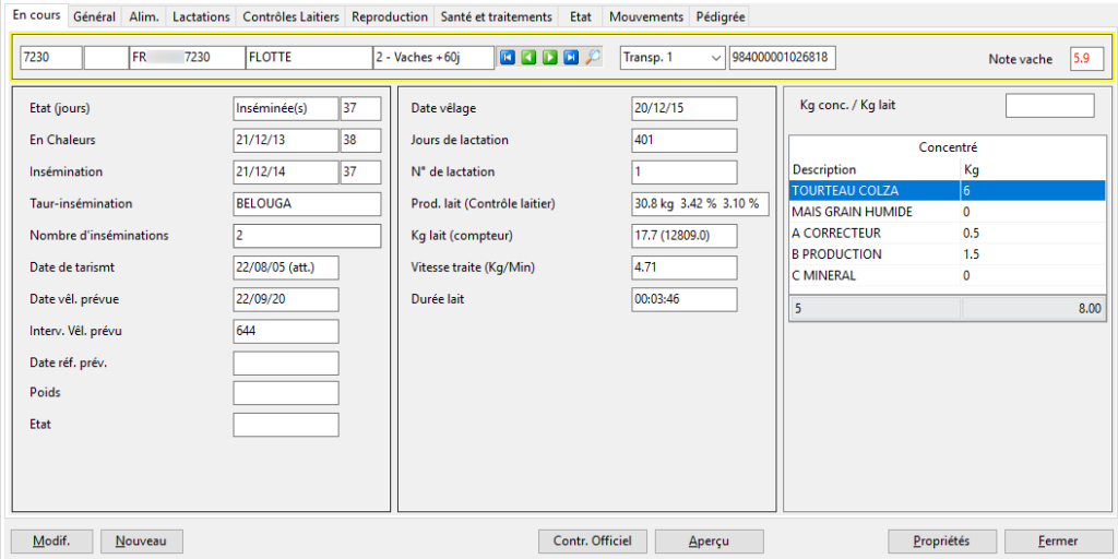 Chaque animal, présent ou sorti, dispose d’une Fiche animal où figurent toutes ses informations individuelles.