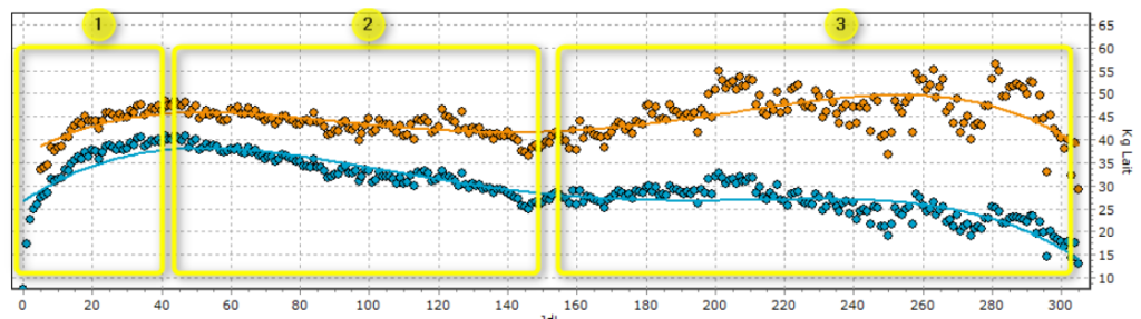→ Après 150 jours la productivité augmente de nouveau, et reste très élevée sur la fin de lactation (3)