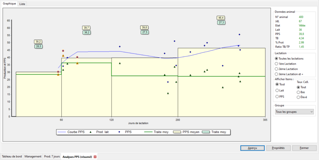 Une vache est représentée par un triangle vert pour la production laitière et un losange bleu pour le PPS. Le graphique est divisé en 4 stades de lactation qui peuvent être paramétrés en cliquant sur le bouton [Propriétés].