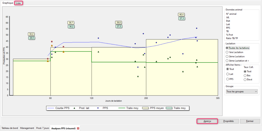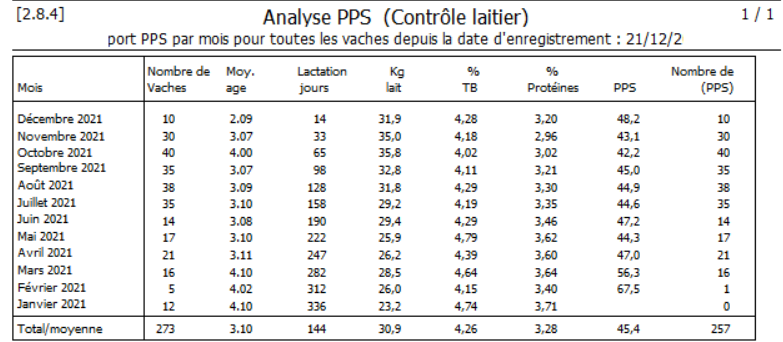Accéder à cet écran en suivant Management/Production laitière/Analyse PPS/PPS par mois après vêlage.