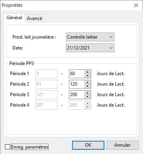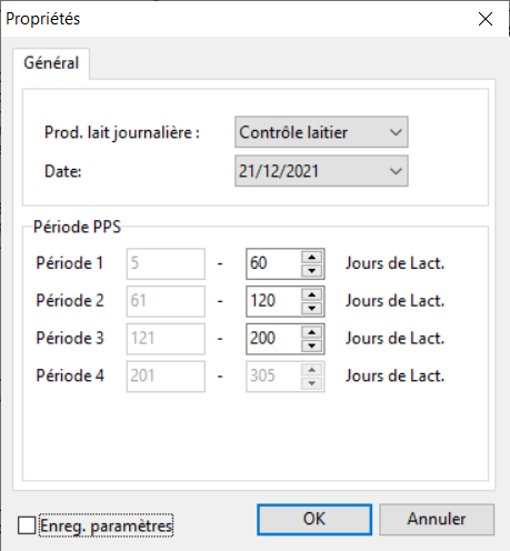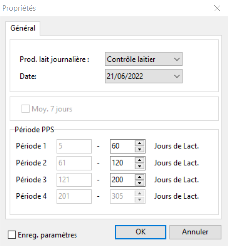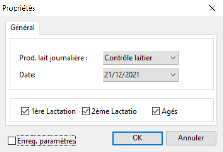 Le bouton [Propriétés] vous permet de choisir le type de production laitière à analyser (contrôle laitier ou compteurs à lait), la date (du contrôle ou des traites) et du nombre de lactations
